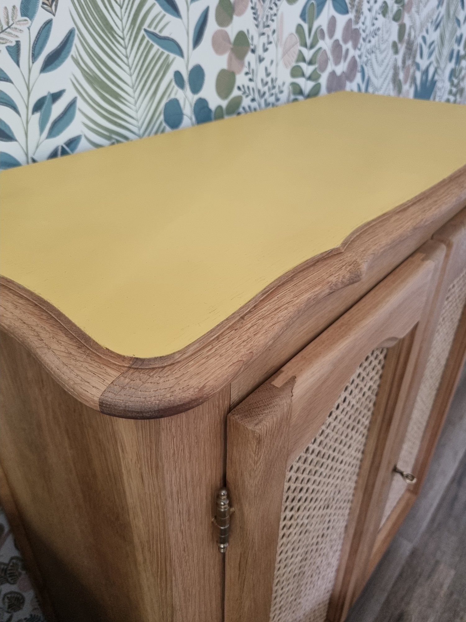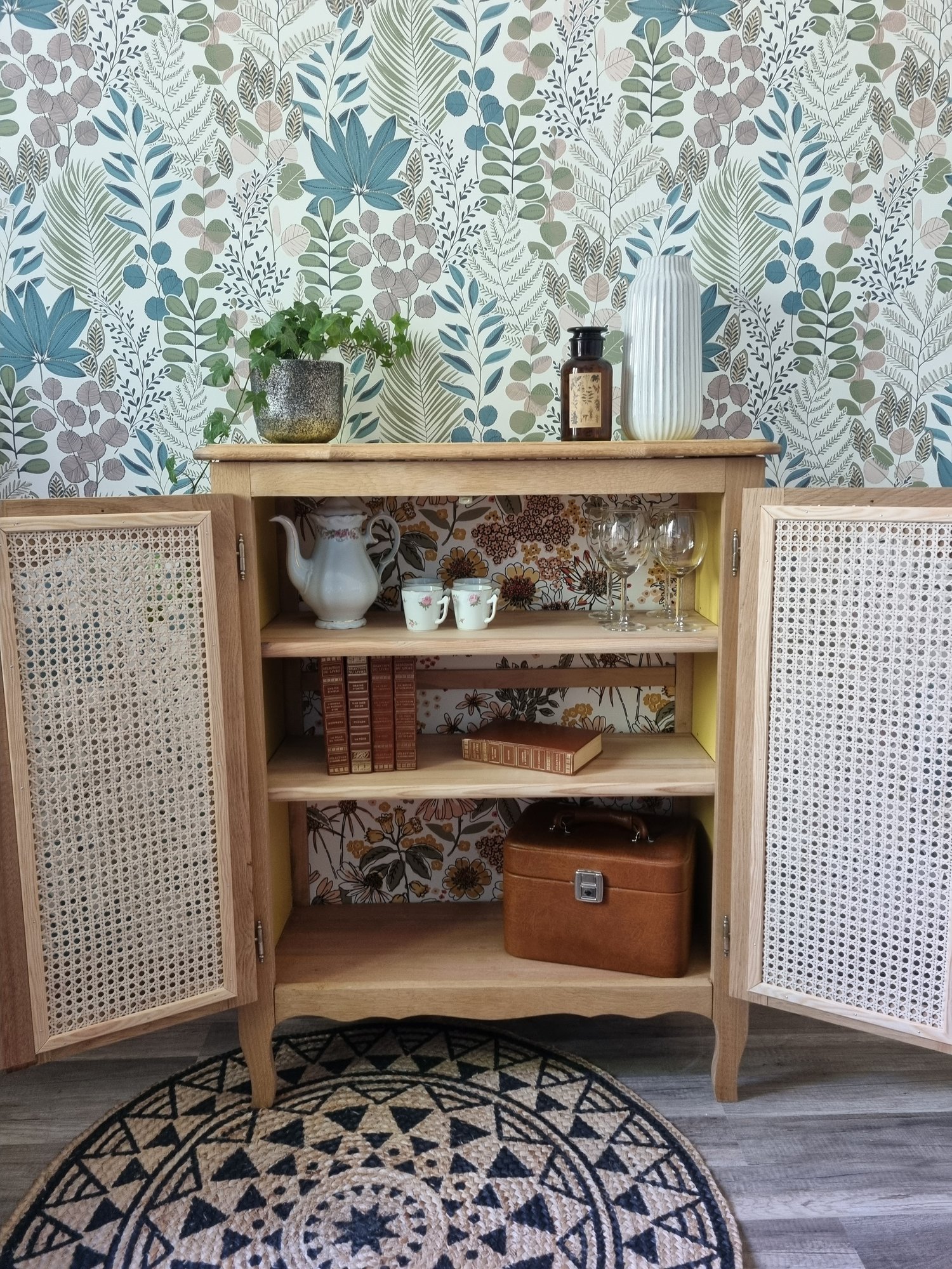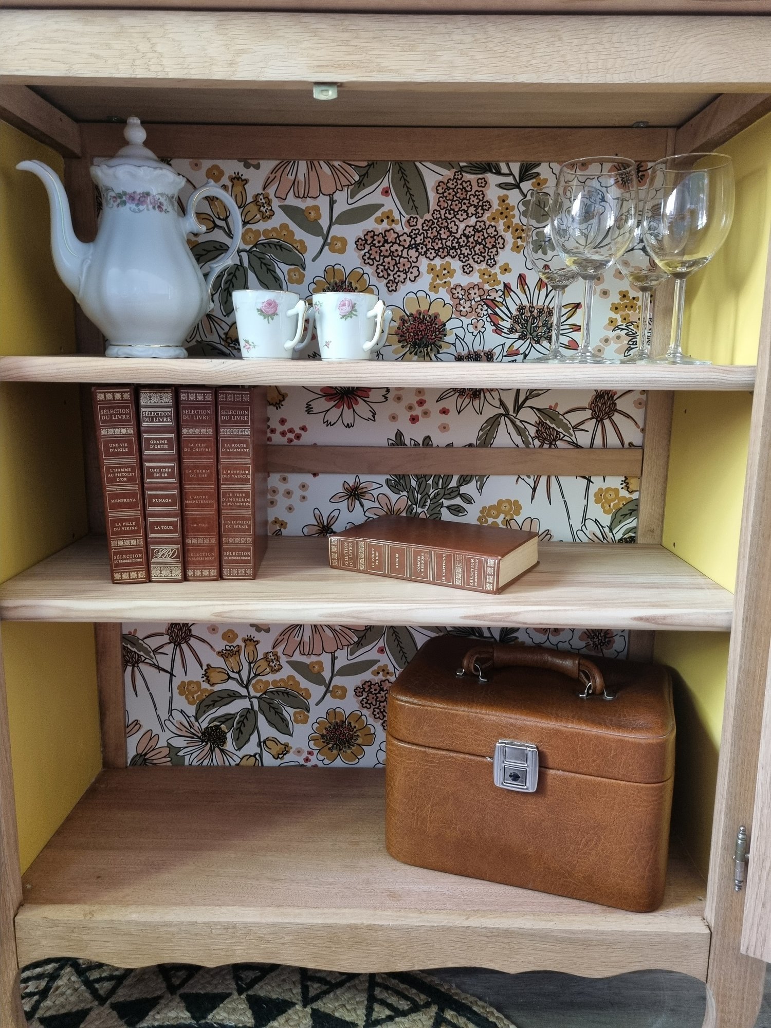 Meuble très printanier grâce à sa couleur jaune et son papier peint floral, il saura à coup sûr mettre du peps dans votre intérieur.