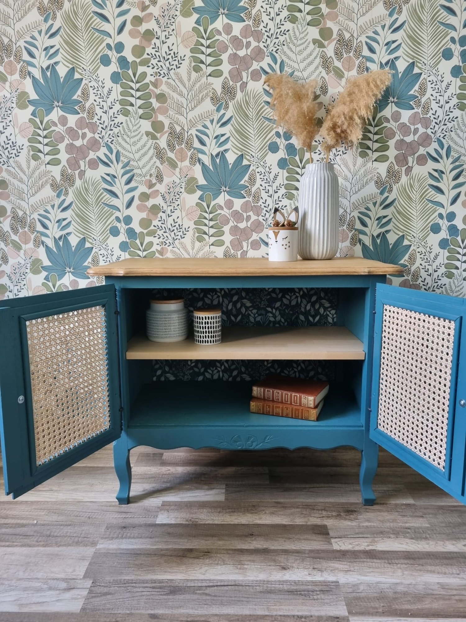 * Pose d’un papier peint de chez 4 Murs au fond du meuble ainsi qu’à l’arrière